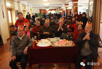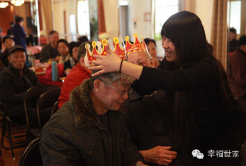 幸福世家的员工为过生日的叔叔带生日礼帽。看员工和叔叔都笑得和花似的,就应该明白,现场的气氛是有欢乐。
