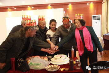过生日的叔叔阿姨们一起切蛋糕,他们的生日蛋糕和寿桃是幸福世家自己制作的,绝对的保质保量。