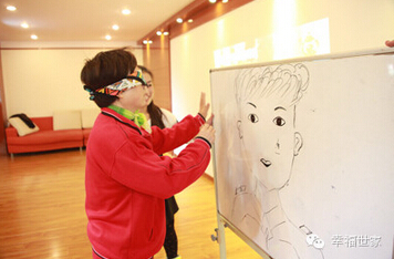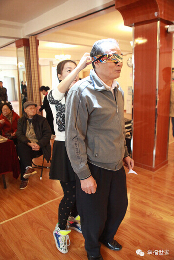 贴鼻子游戏,叔叔阿姨们遮住眼睛,原地转三圈,然后走到黑板前,把鼻子贴在人的脸上。阿姨转了三圈以后,走到白板前面,阿姨您不会是要把鼻子贴在耳朵上吧。
