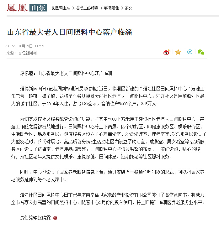 淄江社区日间照料中心日前已与济南幸福世家老龄产业投资有限公司签订了合作意向书,将成为全市首家公办民营的日间照料中心。随着中心3月份的投入使用,将全面提升临淄区养老服务业水平。