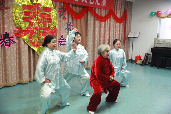 太极拳,以柔克刚,以静制动,以弱胜强,集颐养性情、强身健体、技击对抗等为一体,较为适合老人。行云流水艺术团带来的太极拳表演,动作柔和、松沉柔顺、圆活畅通,静中有动,给热闹的现场增添了不一样的“以静制动”效果。观众们屏气吸声,眼神专注地盯紧表演现场,生怕错过每个细节。尤其是中间那位已近80岁高龄的老人动作敏捷、伸展有力得到观众的一致叹服,节目结束时,好多观众纷纷围着老人请教太极拳的有关招数。
