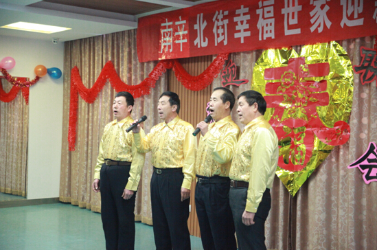 “欢聚一堂……欢聚一堂……听一听幸福和美满的二重唱”,在清幽的《泉水叮咚》之后,一曲男女对唱《欢聚一堂》节奏明快,给节目现场增添了喜庆热闹的气氛,表达出老人们对2015年美好生活的期待。