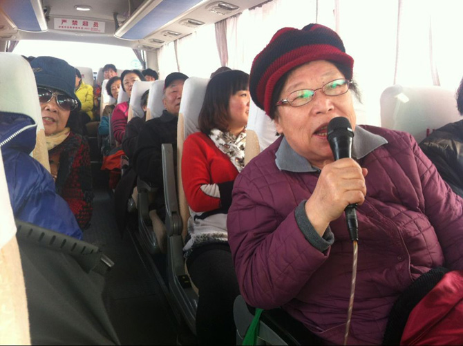 如果坐车只聊天,那您就OUT了,幸福世家的阿姨们总是给大家惊喜,在大巴上,阿姨们纷纷亮出歌喉,给大家带来欢乐了。初春的早上,阳光普照,伴着阿姨们的歌声和笑声,大巴缓缓驶向泰安。