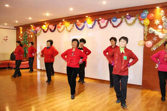 开场表演,阿姨们统一穿着红色上衣、黑色裤子、黑色鞋子,手带花环,为我们带来他们跟着幸福世家老人学习的舞蹈。