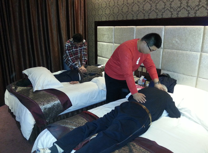 “很暖和,很舒服,解乏”,跑完温泉的阿姨兴致高昂的说。泡完温泉,身体处于放松状态,幸福世家的工作人员专门为这些老人进行按摩,减轻疲劳。