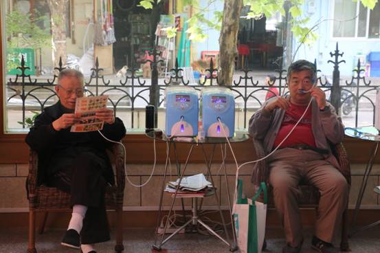 有老人在吸氧,刘光和理事长询问工作人吸氧有什么好处,,每次吸氧多久等问题。工作人员告诉刘理事长,吸氧对老年人的心肺功能有好处,而且有助于延缓衰老,每次需要吸半小时。